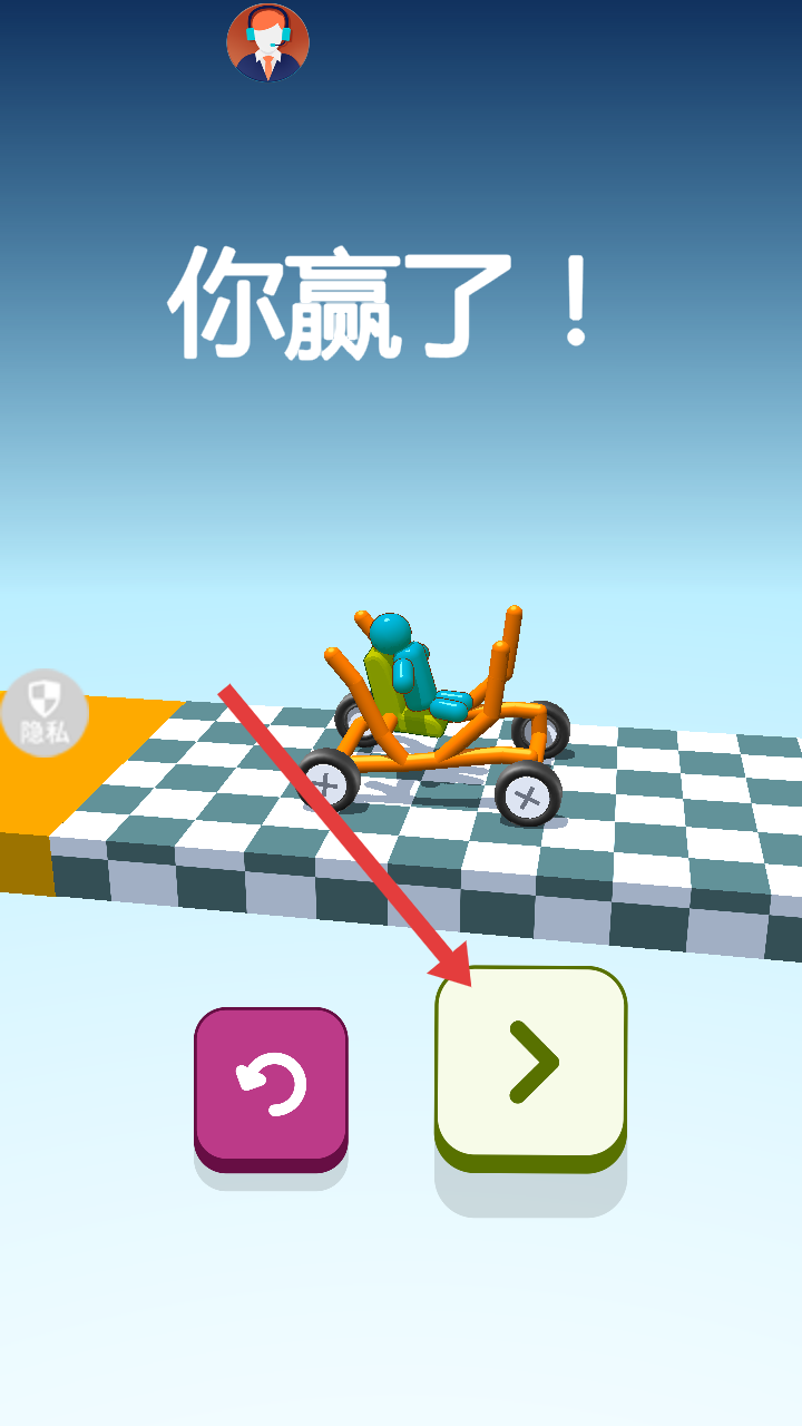 4、成功到达终点后,会显示你赢了字样,此时可点击右侧箭头按钮,进入下一关继续造车闯关。