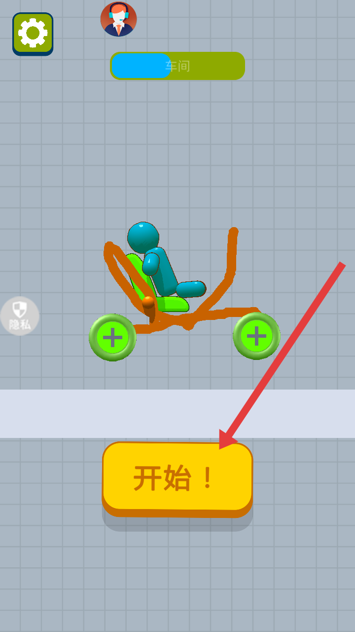 1、进入游戏,能看到一辆简易小车,下方有开始按钮,点击它即可开启造车闯关之旅。