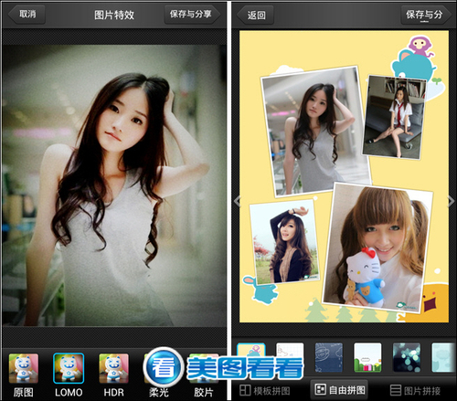 看图分享,已成为我们移动生活的一部分。作为一款流行的看图软件,美图看看pc版的图片一键分享功能,在美图看看苹果版里得到了完美的延续。如图05所示,美图看看苹果版同样可以一键将图片分享到qq空间、新浪微博等处,分享时还可以随手加入微博表情、分享自己的地理位置等信息。