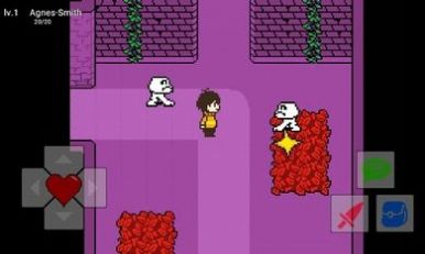 4、去到北面的藤蔓房间内会遇到青蛙froggit,选择行动——赞美,虽然青蛙不知道你在说什么,但他变得很开心,他就会逃离战斗。在右面的水池上有一个尖刺陷阱,Toriel会牵着你的手通过这个陷阱区域。
