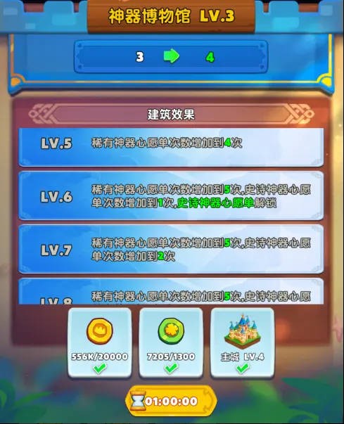 升级神器博物馆可增加神器心愿单次数,建筑等级高时还可解锁高品质神器心愿单槽位,在心愿单内填入自己心仪的神器后探索神器时会优先获取到自己想要的神器。