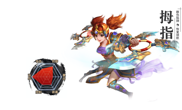 拇指属于近战职业,她修炼木属性的内功,使用手中的飞镖和铺设的陷阱作为武器。不同于其他角色在战场中的输出与抗伤,拇指主要侧重于在队友身后为团队提供支援辅助,她也是唯一一名拥有治疗技能的角色。同时,拇指擅长使用陷阱为敌方附着减益效果,增加全队的输出。
