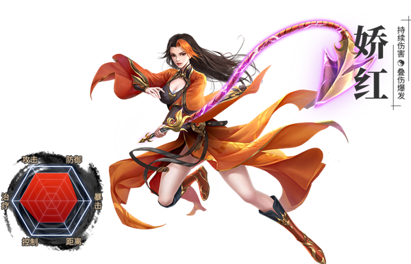 娇红手持长鞭,修炼火属性的内功。原本是名门女神堡主的千金,但自幼美丽,身材傲人的娇红,却偏偏不爱红妆而痴迷武功,依靠祖传的鞭技独步江湖。