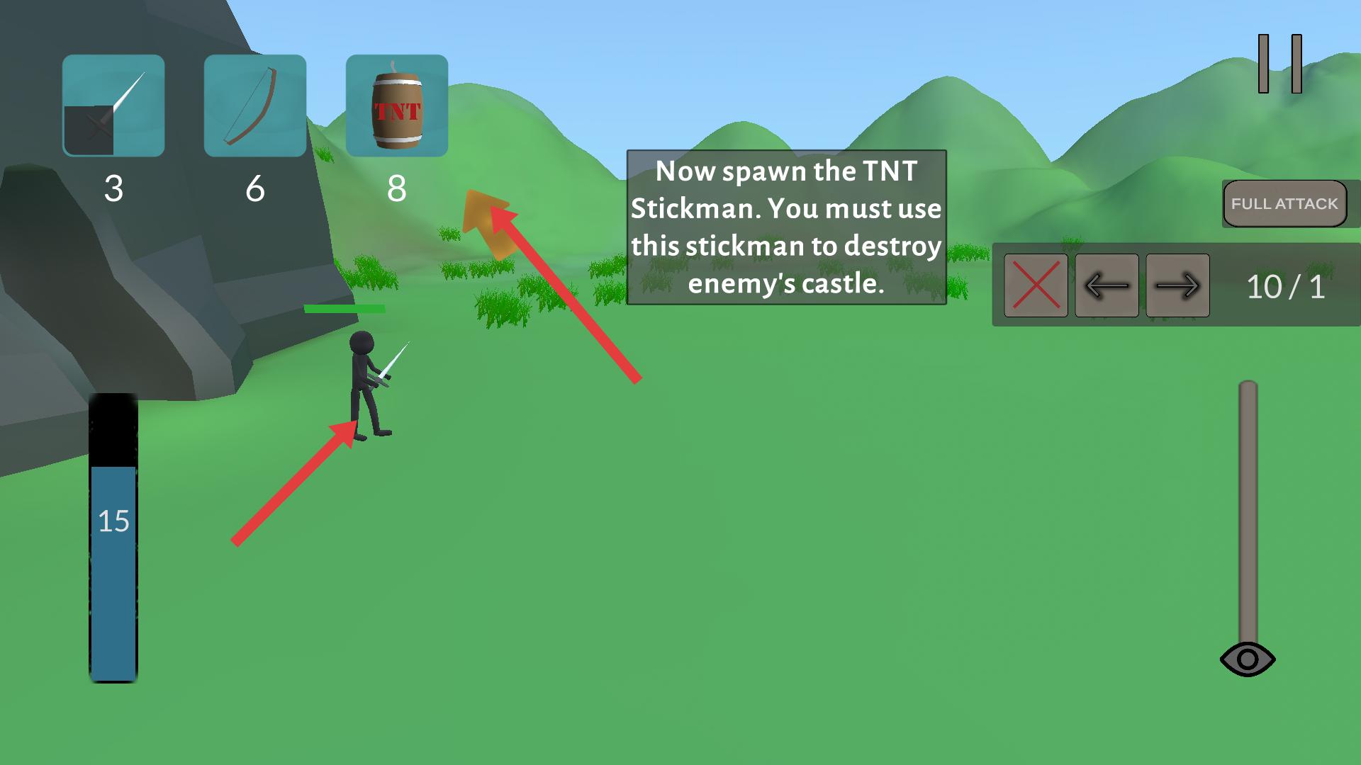 3、提示生成TNT火柴人,用其摧毁敌方城堡,点击TNT选项生成TNT火柴人,指挥它向敌方城堡移动,利用其爆炸能力破坏城堡,推进战斗进程。