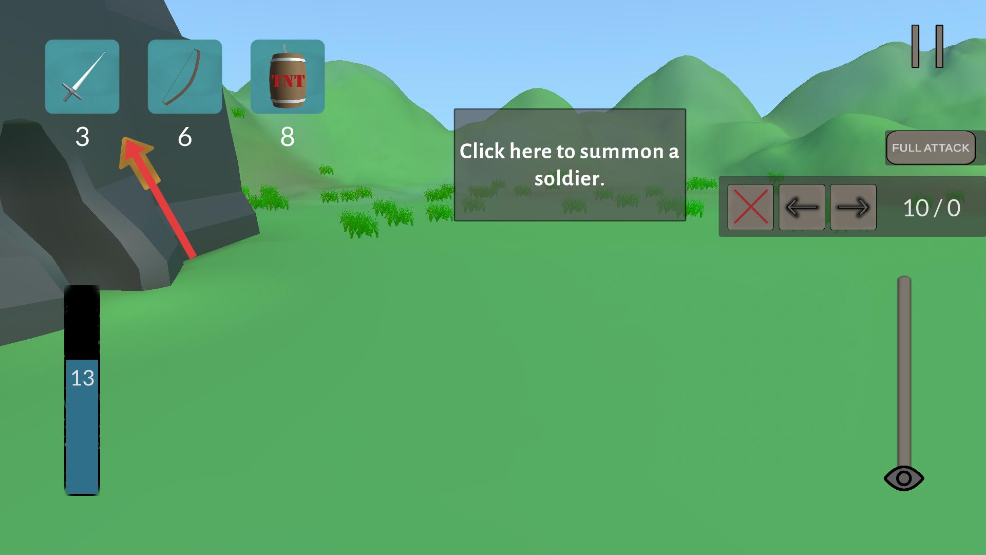 2、战斗界面有剑、弓、TNT等选项,提示点击召唤士兵,要根据提示,点击对应区域召唤士兵,让士兵参与战斗,助力击败敌方,熟悉召唤操作。