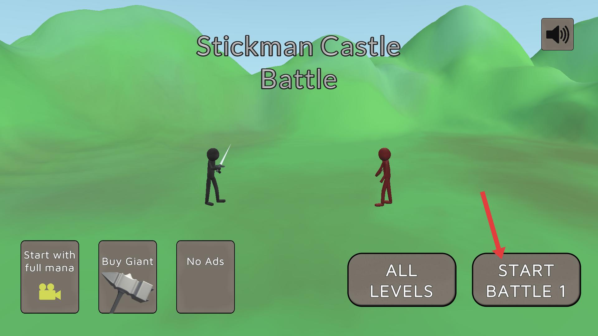 1、游戏初始界面点击箭头所指按钮,点击该按钮可进入第一场战斗,开启与敌方火柴人的对战,推进游戏进程,体验战斗玩法。