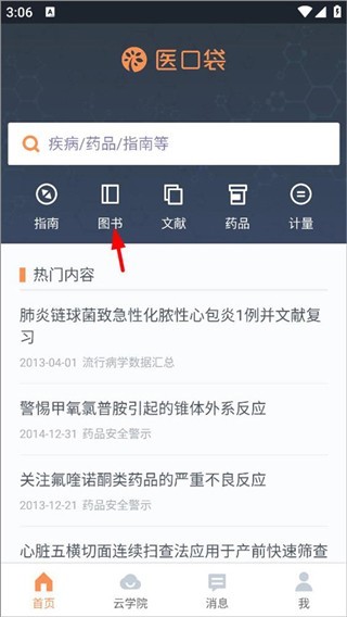 1、打开医口袋,登录进入首页,用户可在首页查看热门内容,点击图书;