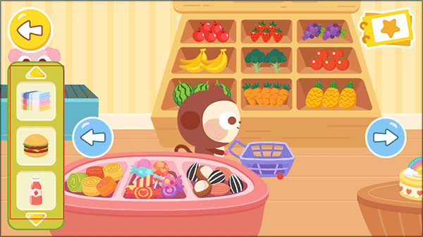 1、进入游戏后,购物车旁的电子屏显示着本次需购买的物品清单,清单上的商品图片与对应区域的货架陈列一致,清晰指引着购物目标。