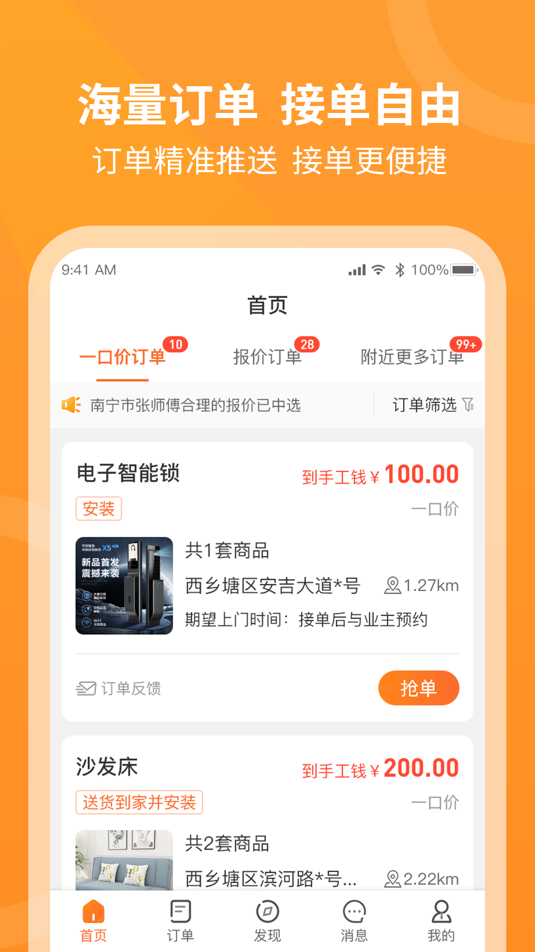 【实时接单】: 订单列表,一目了然,师傅可实时查看本地派单动态,接单更便捷;