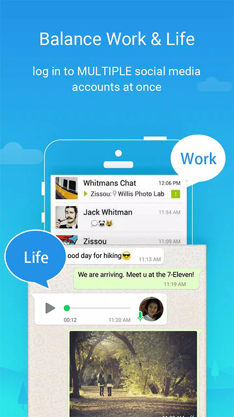 平行空间双开助手可以登录新的微信和QQ,和不同的朋友聊天,发朋友圈展示自己的另一面,为自己点赞。