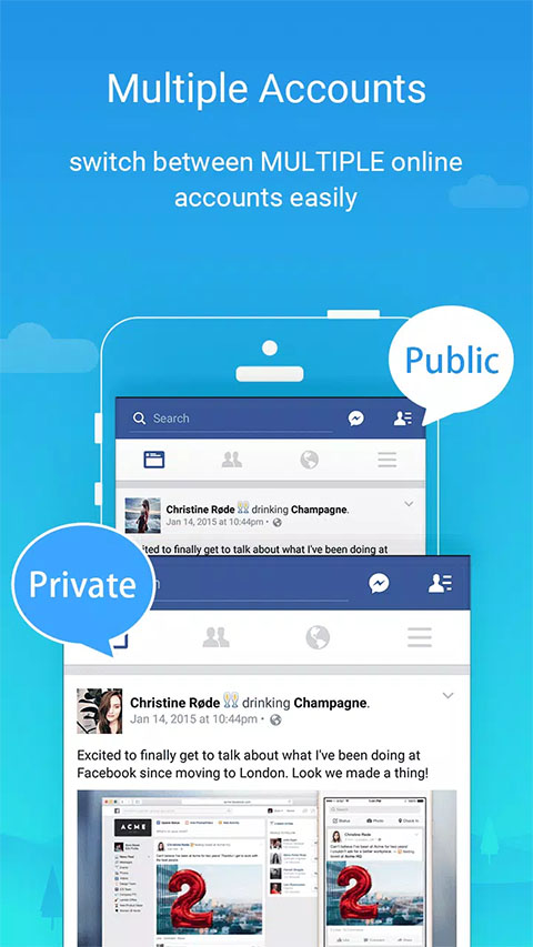 平行空间双开助手无需重新登录微博或贴吧,直接在一部手机上浏览不同账号的信息,发布新的消息和照片,完美展示自己的每一面;