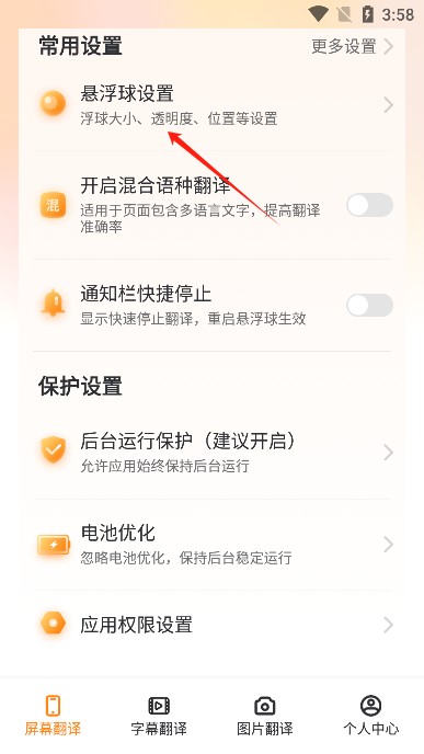 4、悬浮窗设置完毕后就能一键完成屏幕内容翻译了,你还可以设置悬浮球的大小透明度等参数