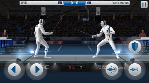 1、游戏的操作简单,采用的是虚拟按键,与横版格斗游戏类似:左侧箭头为控制运动员前后移动,右侧按键是弓步突刺、直刺和格挡等招式。玩家操控运动员与对手保持合适的距离,判断出招方式就能击中对手有效部位,获得比分。