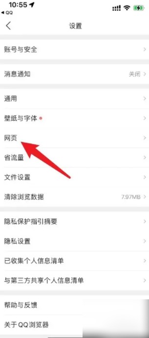 1.打开腾讯浏览App,进入设置页面,点击网页选项