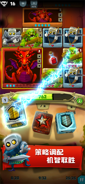 3、下坠眩晕可以+1s:上方单位一轮攻击总和很高那么集火(技能+锁定攻击骰子)下方单位,有时候要节省锁定点数或者技能,那就用消耗小的方法干掉当中的。