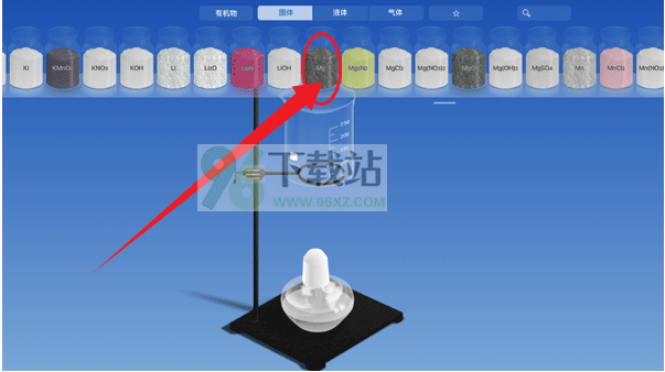 2、点击屏幕上方的“化学物质”按钮,在弹出的列表中选择你需要的固体试剂,比如镁粉(Mg)。