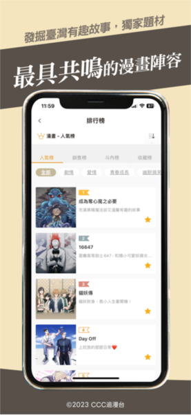 1. 漫画分类:CCC追漫台将漫画作品按照题材、地区、进度等多种方式进行分类,方便用户快速找到感兴趣的漫画。