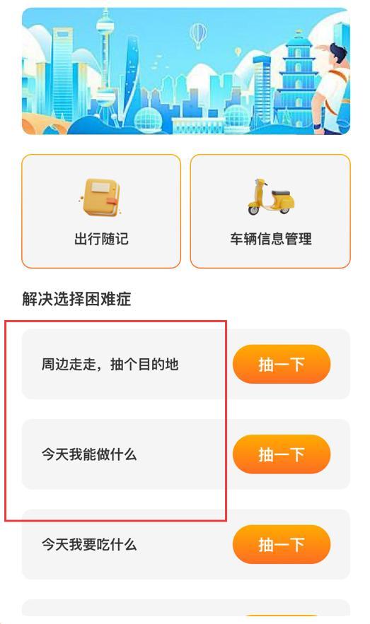 1、第一张图实体信息,有出行随记车辆信息管理功能,还有解决选择困难的周边走走,抽个目的地。
