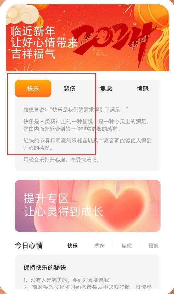 2、阐述快乐感受及音乐影响,还有提升专区让心灵得到成长及今日心情相关内容。