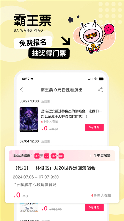 热门演出每周抽奖,轻轻一点,免费带你亲临爱豆现场。