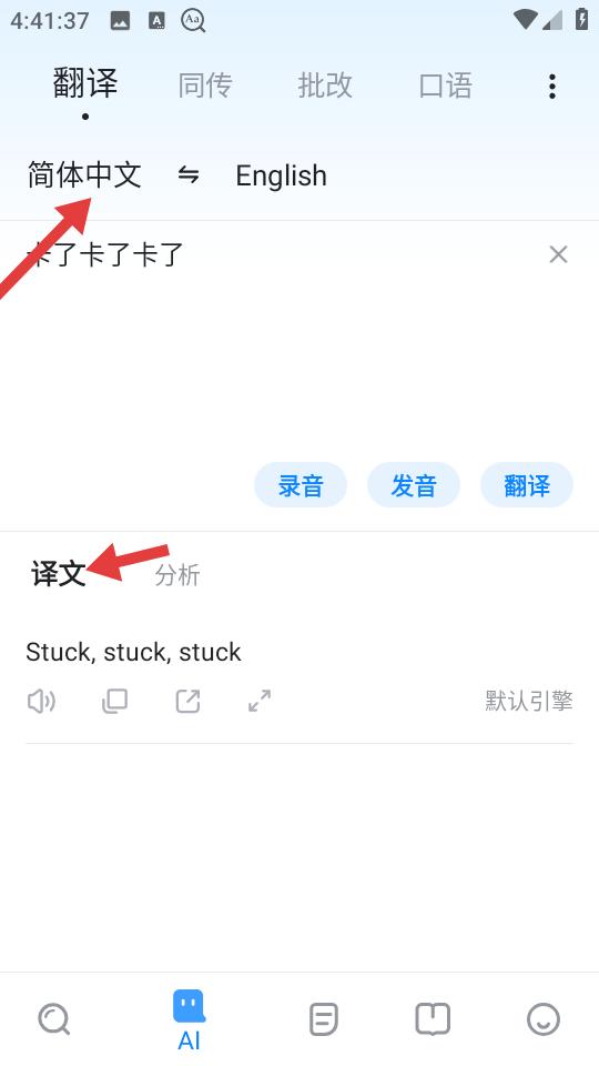 3、翻译界面设语言切换左侧输入简体中文,下方译文区呈现对应英文,录音发音翻译按钮辅助,方便用户实现语言互译。