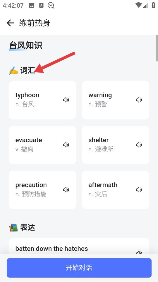 2、练前热身界面聚焦聚焦台风知识,词汇板块陈列typhoon warning等单词及释义,配发音按钮,帮助用户积累相关词汇。