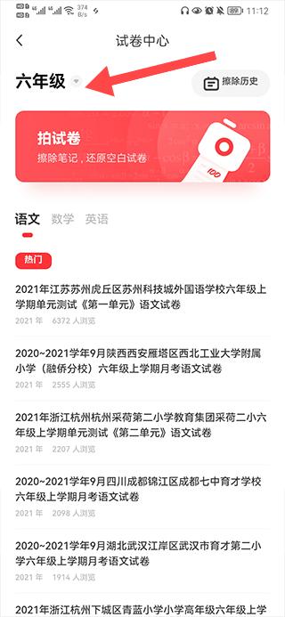 2、试卷中心界面,定位六年级,可拍试卷擦除笔记还原空白卷,展示多份语文、数学、英语热门试卷,来自各地学校,供学生练习和测试。