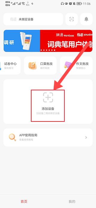 1、首页显示未绑定设备有词典笔用户调研等宣传,设有添加设备功能,可扫码绑定,还有试卷中心、口算批改、作文批改等模块,方便学习辅助。