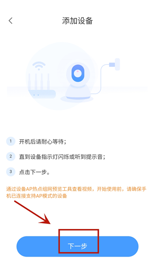 6、需要先将设备开机,直到设备指示灯闪烁或听到提示音时,点击下一步。