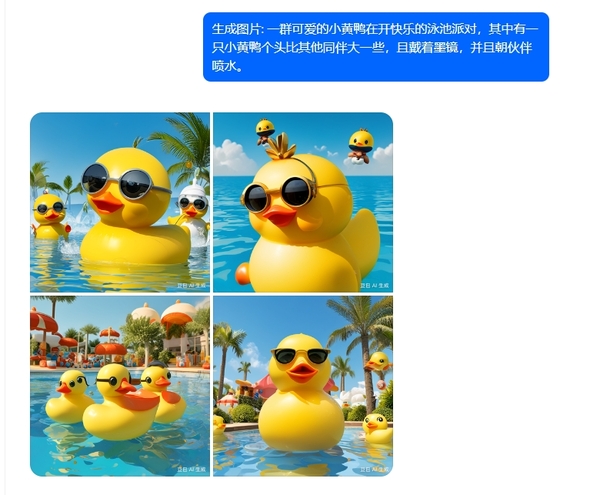 举个例子:就拿小黄鸭开泳池派对来说,如果我们想突出其中一只小黄鸭,那就可以添加一些描述,比如“让其中一只小黄鸭个头大一些”、“其中有一只小黄鸭戴着墨镜”、“有一只小黄鸭在朝其他伙伴喷水”等。