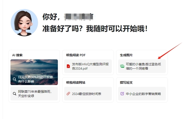 ②接着可以看到众多AI内容,其中就有【生成图片】,点击可以先查看示例的情况是如何生成图片的。