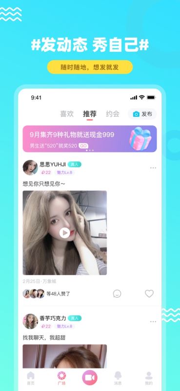 6、进入广场,有很多用户在这里分享自己的生活,大家点击发布就可以分享自己的生活了。