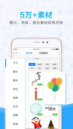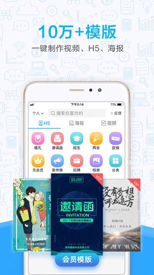 适用于教育培训、招生迎新、企业招聘、个人名片、个人简历、音乐相册、H5、办公文档、GIF动图、美照拼图、邀请函、节日促销、宣传营销、广告推广、贺卡请柬、电商详情页、视频等,满足生活、商业、娱乐等各场景。