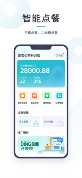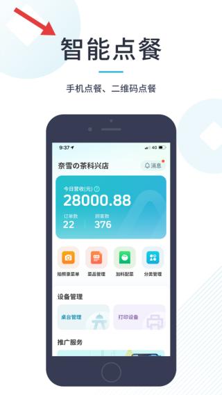 1、呈现智能点餐界面,支持手机及二维码点餐,显示奈雪の茶科兴店当日营收等数据,有多项管理功能。