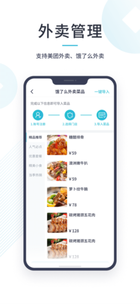 2、展示外卖管理界面,支持美团、饿了么外卖,呈现饿了么外卖菜品列表及价格等信息。