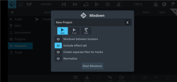 3、然后点开左上角,点mixdown里最上边的create mixdown;