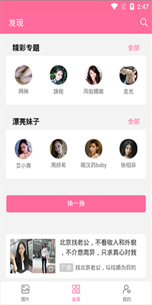 2、点击发现可以看见很多漂亮妹子,也可以发表自己的自拍照。