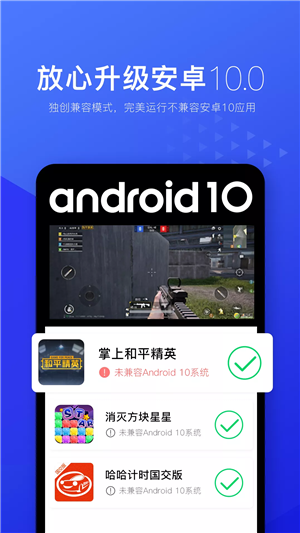 独特的兼容模式,非常适合运行与Android 10不兼容的应用程序。非常适合在Android 10手机上运行掌上和平精英、同事应用程序和独立应用程序。