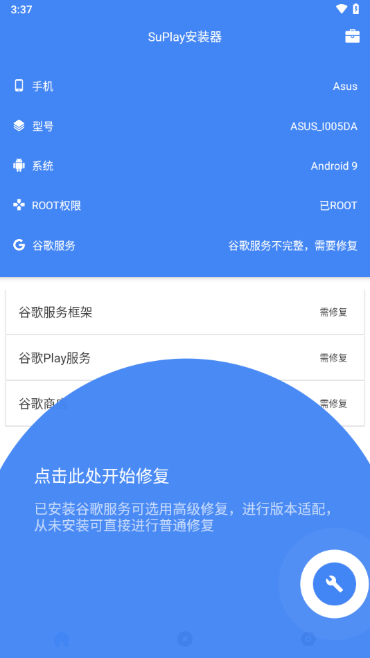 1.软件会自动获取你的手机信息,之后点击下方的修复键位,对谷歌服务进行修复。