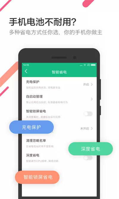 快速省电、超级省电、模式切换、低电量提醒、内存清理,全方位智能省电,让爱机更持久。