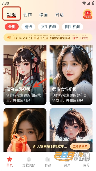 打开app,用户们可以在视频页面挑选自己喜欢的故事风格生成视频,有仙侠古风,都市言情,动漫视频等