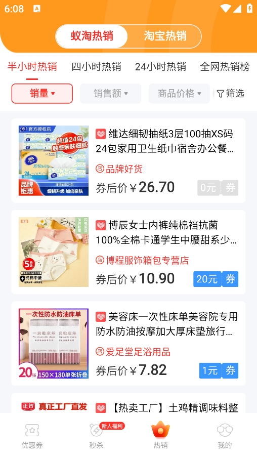 2、打开热销页面,用户可看到软件热销商品、淘宝热销商品,该页面的商品推广分为半小时热销、四小时热销、24小时热销、全网热销等,点击产品