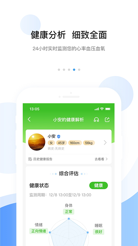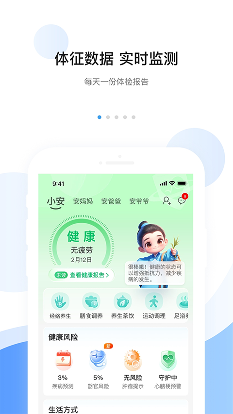 对心率、血压、血氧等数据进行趋势监测,分析长期变化曲线,解析用户健康状态;日监测近2000个生理指标,通过 安顿心肌梗死、脑卒中风险发生先兆病理模型和器官健康状态模型进行分析,评估用户健康状态,对疾病风险提前预警。