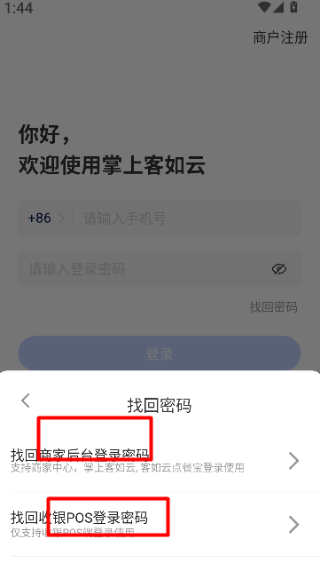 2、进入后可选择两种找回方式,分别是通过商家后台登录找回和通过收银 POS 登录找回,按需选定。