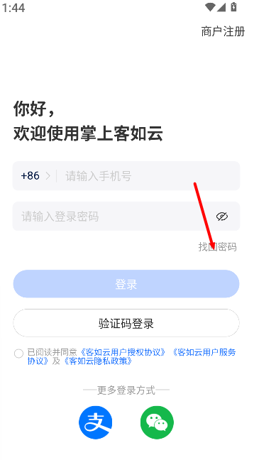 1、打开《掌上客如云》APP,在登录页面找到 “找回密码” 选项,点击进入密码找回流程。