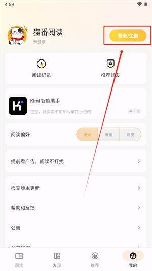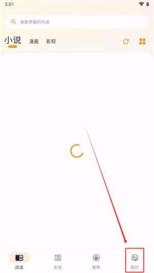 1、打开手机上下载的猫番阅读app,在下方导航栏中点击切换到【我的】;