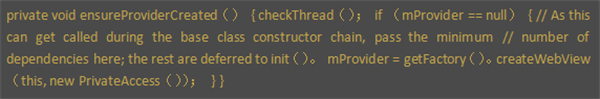 这个构造函数会调用另外一个成员函数ensureProviderCreated()确保Chromium动态库已经加载。在Chromium动态库已经加载的情况下,WebView类的成员函数ensureProviderCreated还会创建一个WebViewProvider对象,并且保存在成员变量mProvider中。这个WebViewProvider其实才是真正用来实现WebView的功能的幕后大佬。上诉那些Android WebView主要的方式基本都是通过mProvider来实现的,例如loadUrl(String url)等方法。