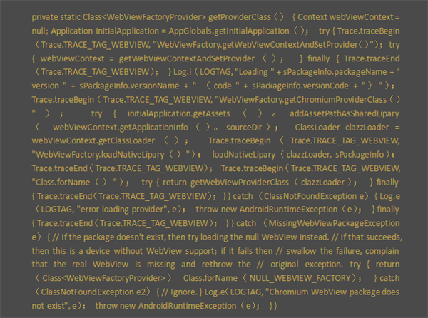 WebViewFactory类的静态成员函数getProvider首先要确定要创建的WebView Factory的类型。这个类型是通过调用另外一个静态成员函数getFactoryClass获得的: