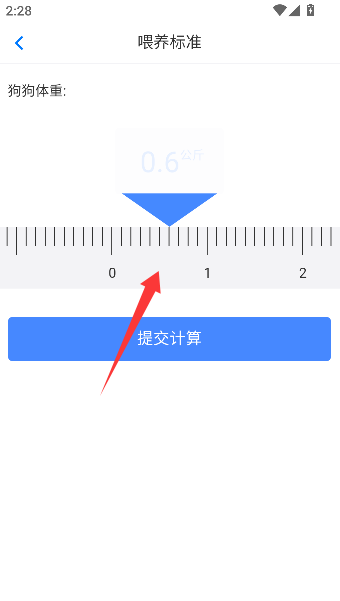 2、看到那只可爱的卡通尺子了吗?把蓝色小标识拖来拖去,对准你家狗主子的实际体重,别虚报哦。