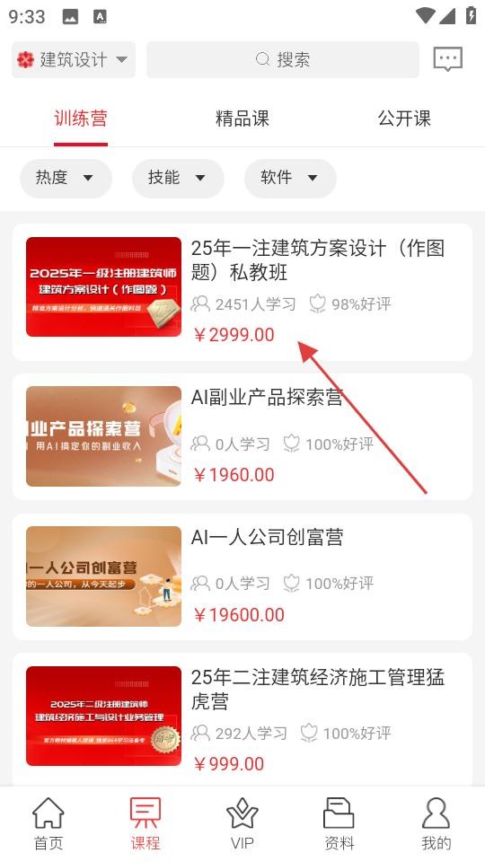 2、切换到课程页面,在训练营、精品课、公开课分类里,依据热度、技能、软件筛选,找到适配课程,查看学习人数、好评率及价格,点击即可报名学习句号。